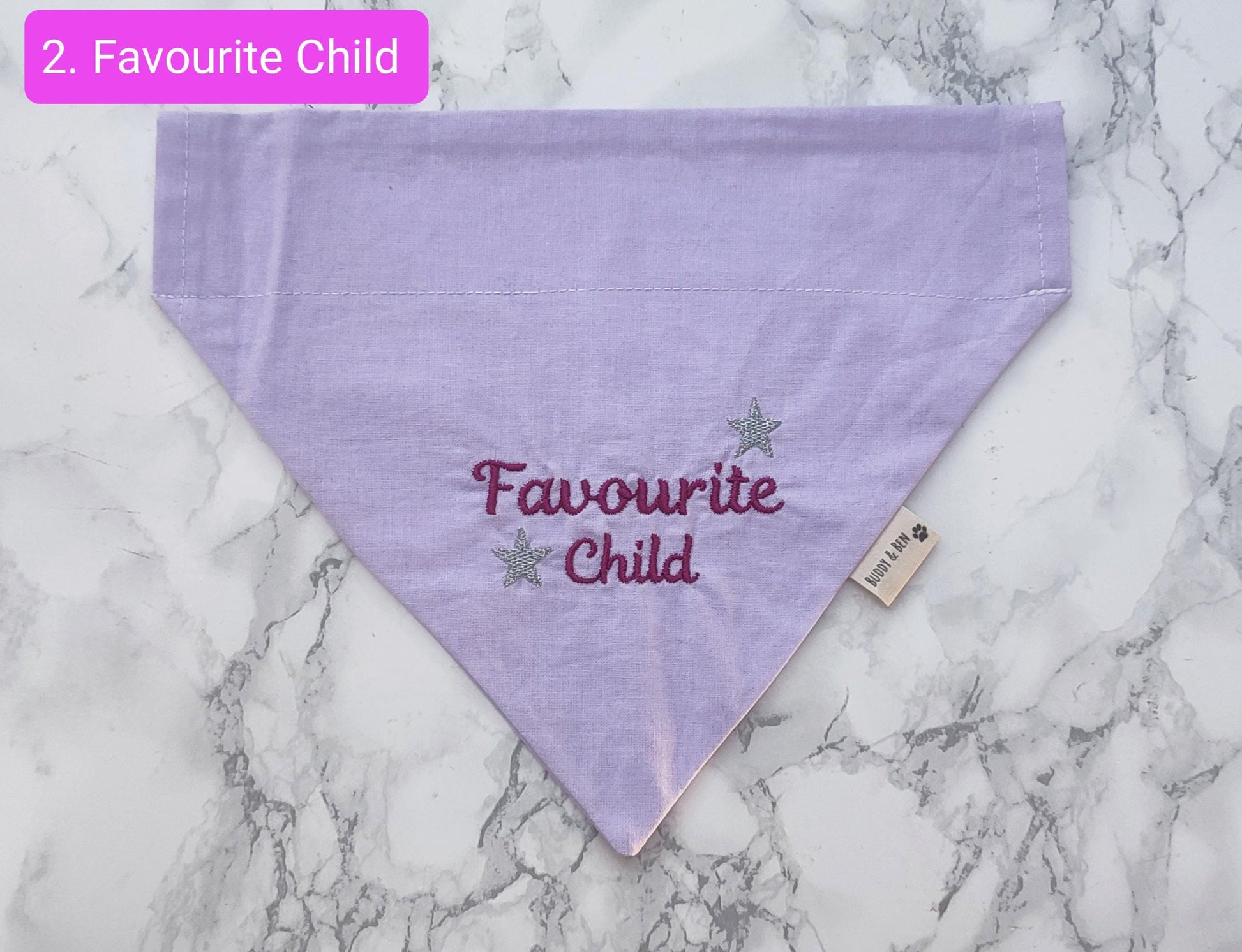 2. Favourite child size L - embroidered slogan on plain lilac cotton fabric with sewn in logo label