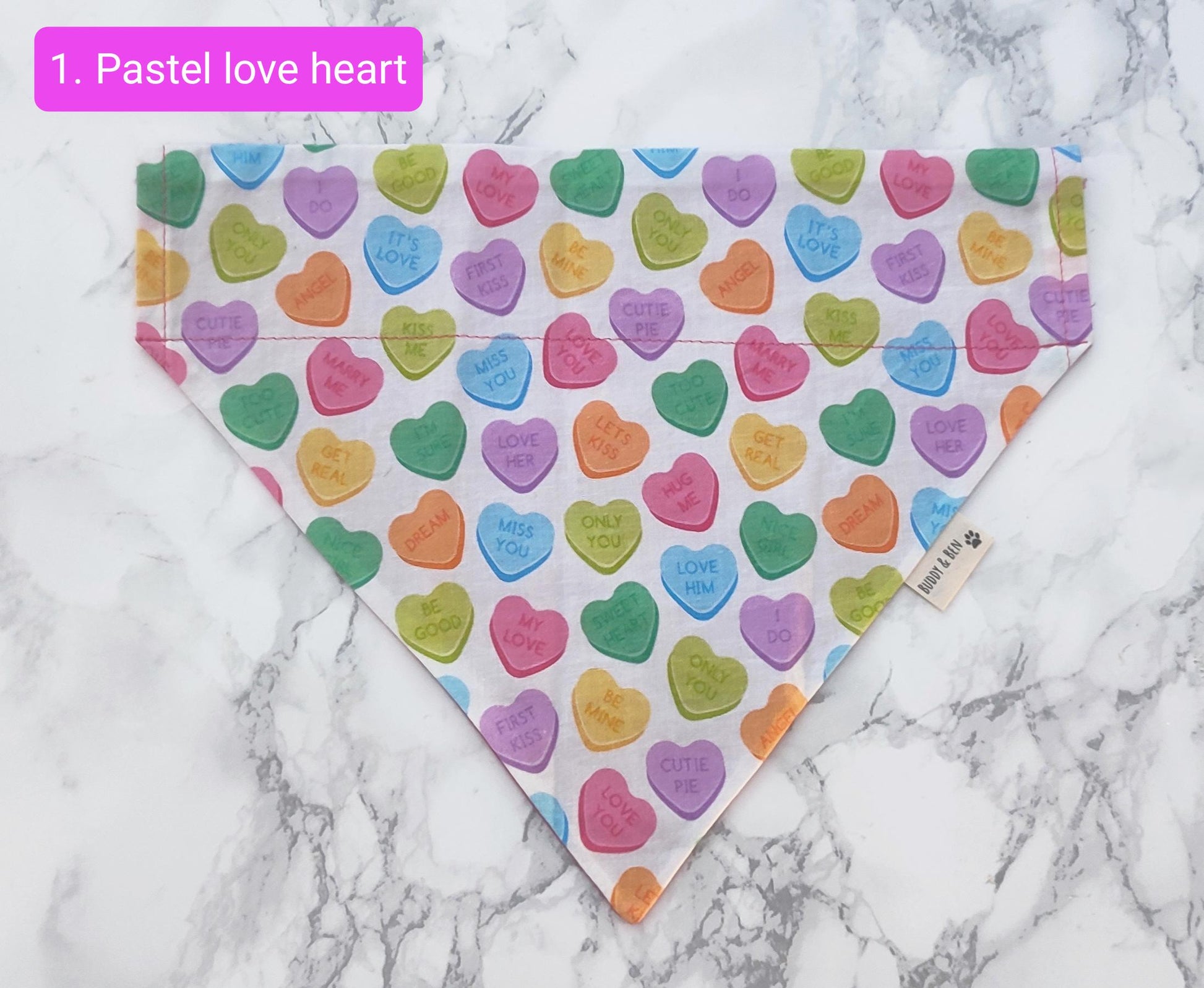 1. Pastel love hearts size L - pastel love hearts on white background with dusky pink fabric on reverse with sewn in logo label