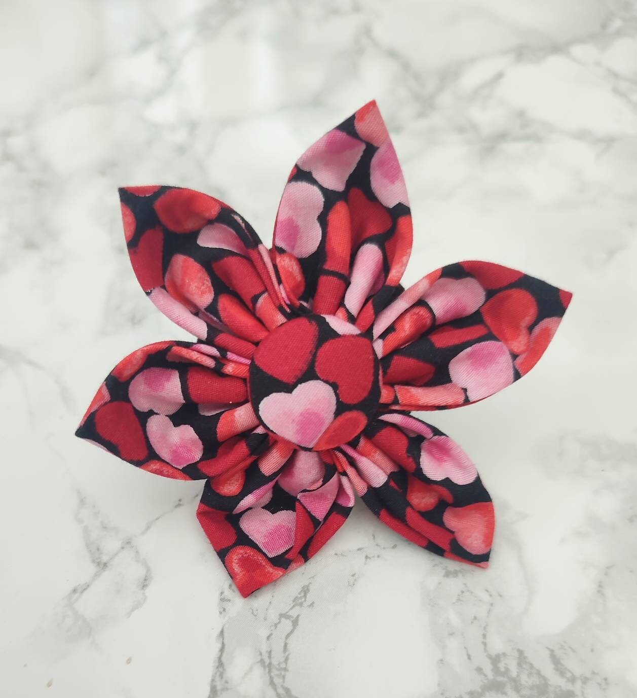 This Gorgeous little flower is made from the confetti hearts cotton fabric. It features 6 petals and a covered button in matching fabric.