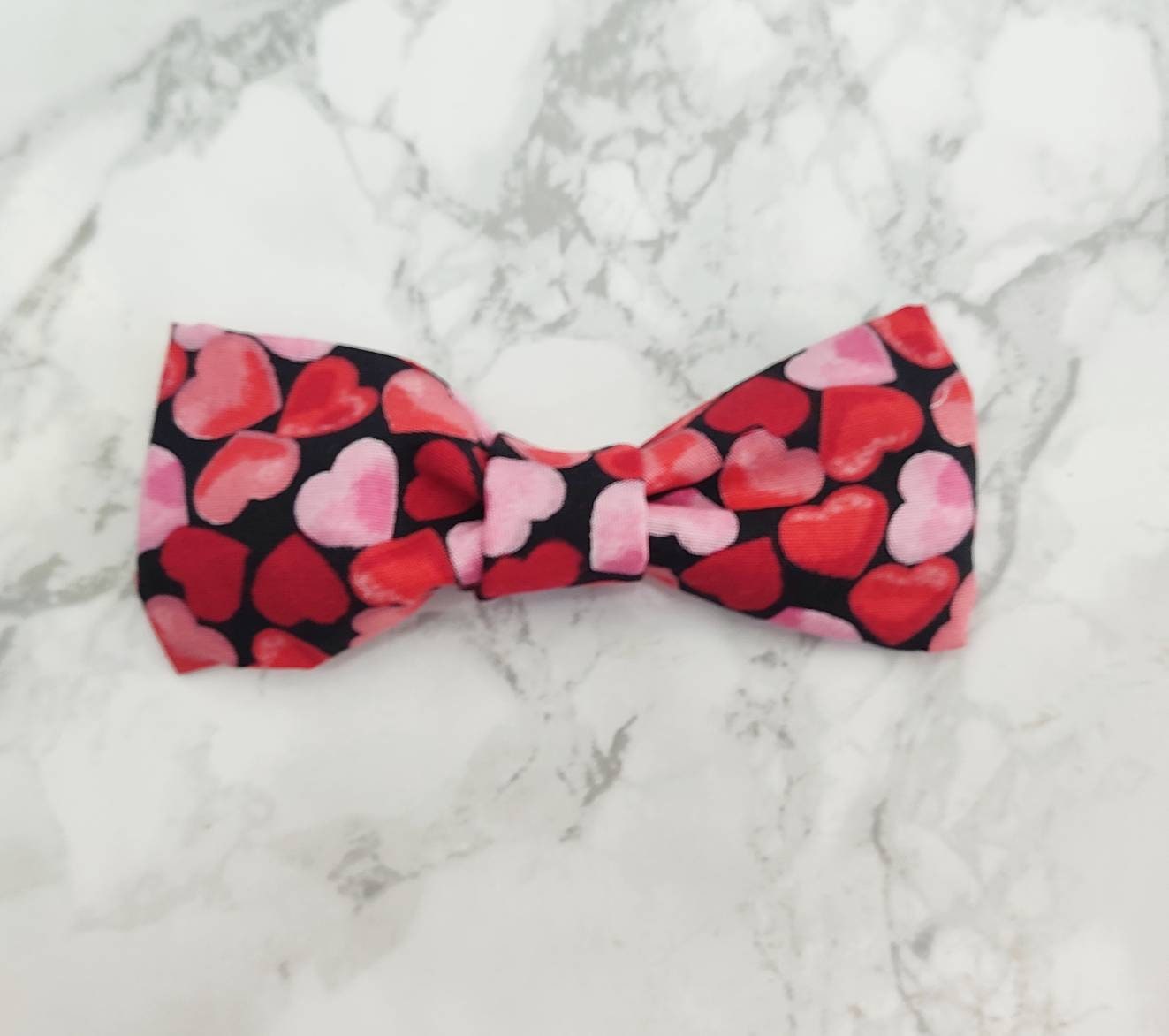 This cute heart print bow is the perfect easy fit accessory for your dog this Valentine's day! It attaches to your dogs collar with one easy hook and loop tape strap, making it easy to put on without having to remove your dogs collar.