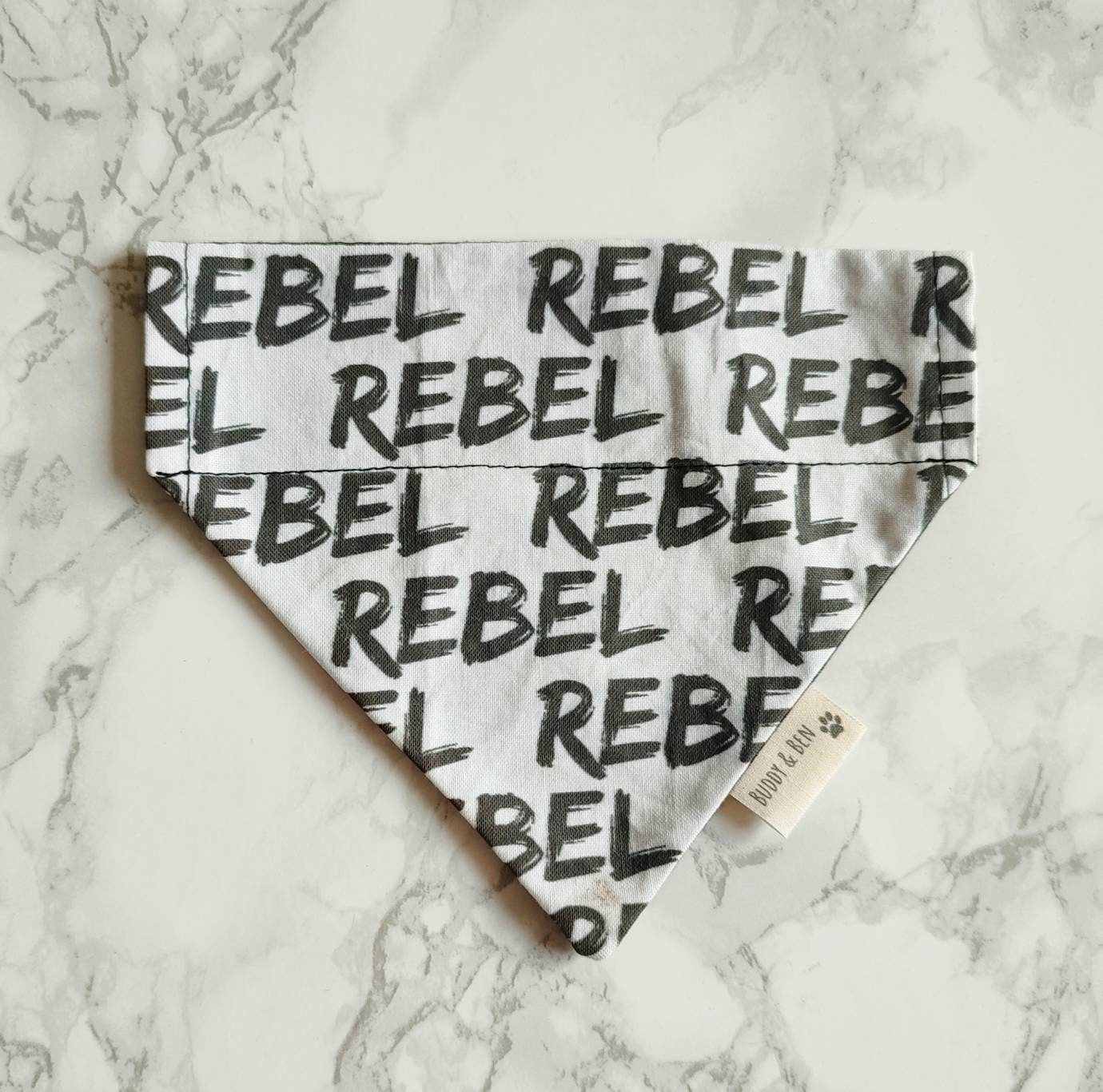 Got a little rebel in your life? Sock theif? Cushion destroyer? Our Rebel bandana is perfect for the little troublemaker in your life! This bandana features black rebel text on a white background, plain black fabric on the reverse and matching black topstitching.