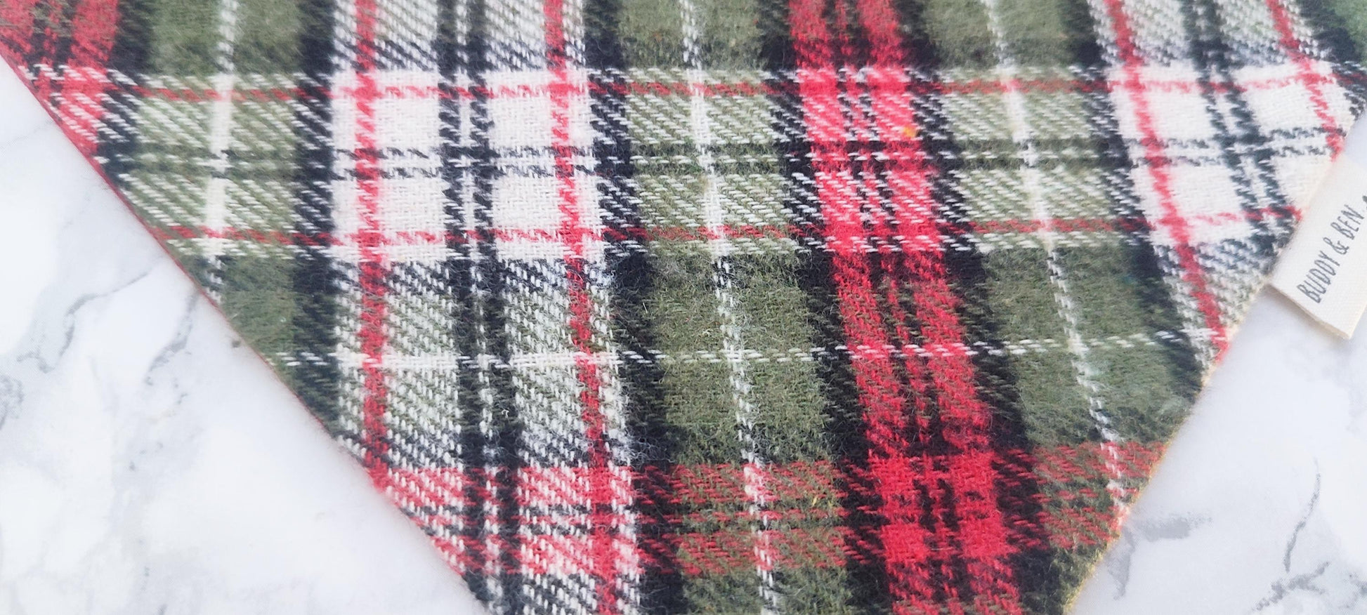This bandana features a soft front fabric of red, green and white tweed style check, with a plain red cotton on the reverse side. This bandana is in the over the collar style where the collar is slipped through the gap in the bandana, meaning no needs for clips or knots!!